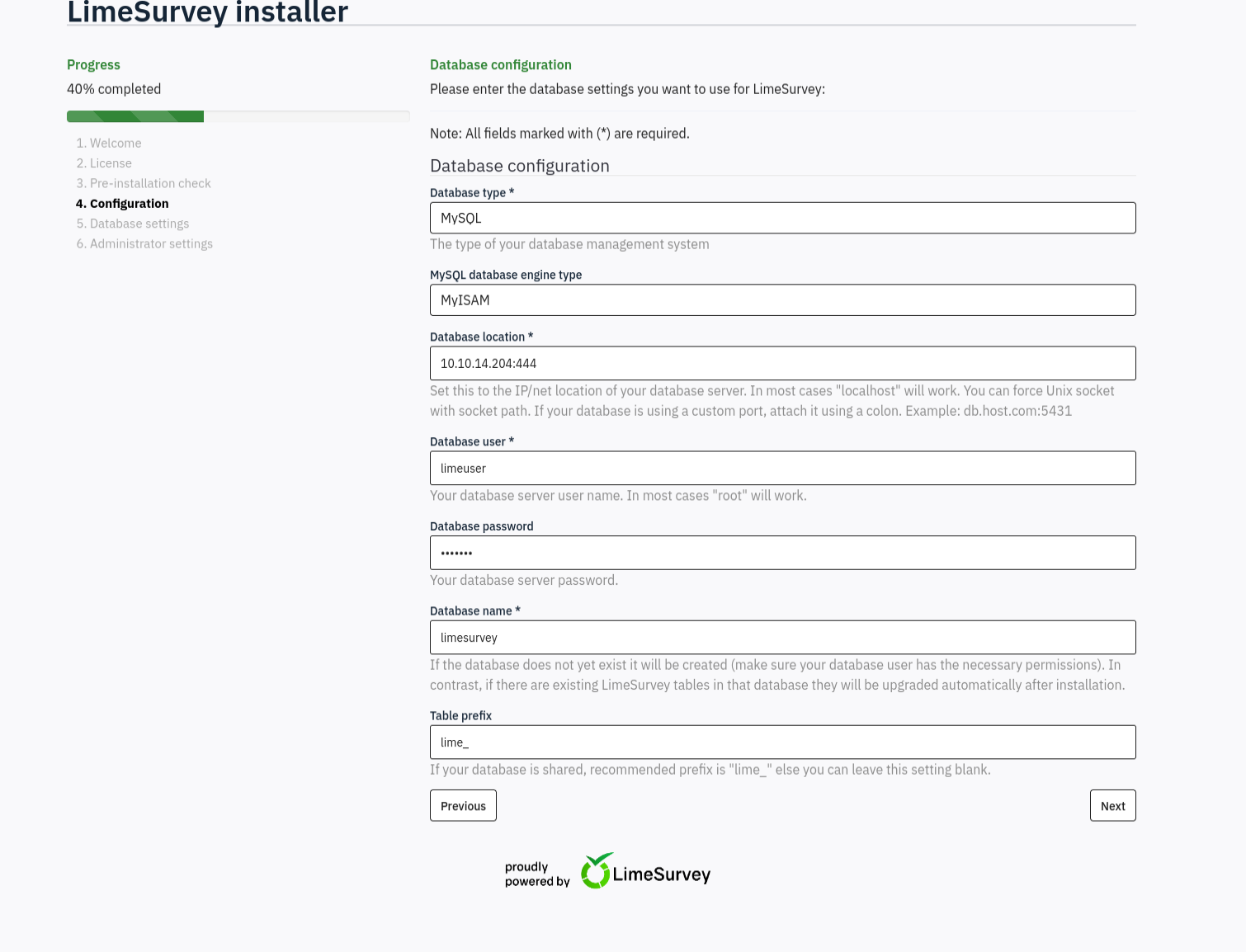 Going to the Survey Installer page we find a LimeSurvey installer. It tells us LimeSurvey 6.3.7 is used. We cannot complete the installer because it can't find a database. We can setup a database on our machine and let the installer use it.